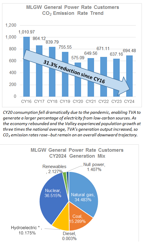 TVA’s 2024 system-wide carbon emission rate of 679.84 CO2 lbs/MWh is 24% below the current EPA eGRID regional average of 895.69 CO2 lbs/MWh and 12% below the EPA eGRID national average of 771.52 lbs/MWh. Your organization will benefit from using the CO2 emission rate associated with your MLGW electricity purchases, rather than the current eGRID data, for Scope 2 carbon reporting.